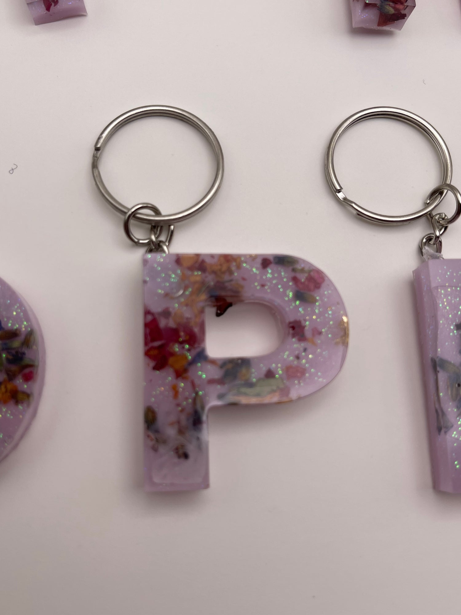 Letter keychains, handcrafted from resin made with real flowers. Customizable